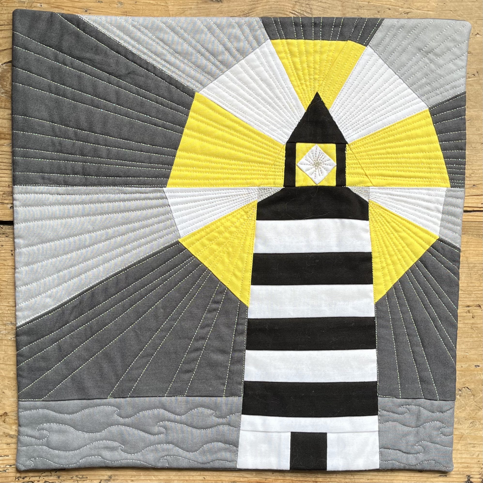My husband works in an alternative education setting where they provide education and nurturing for young people who have been lost within mainstream education. The centre is aptly called “The Lighthouse”. I designed the foundation paper pattern myself and machine quilted it with metallic threads.