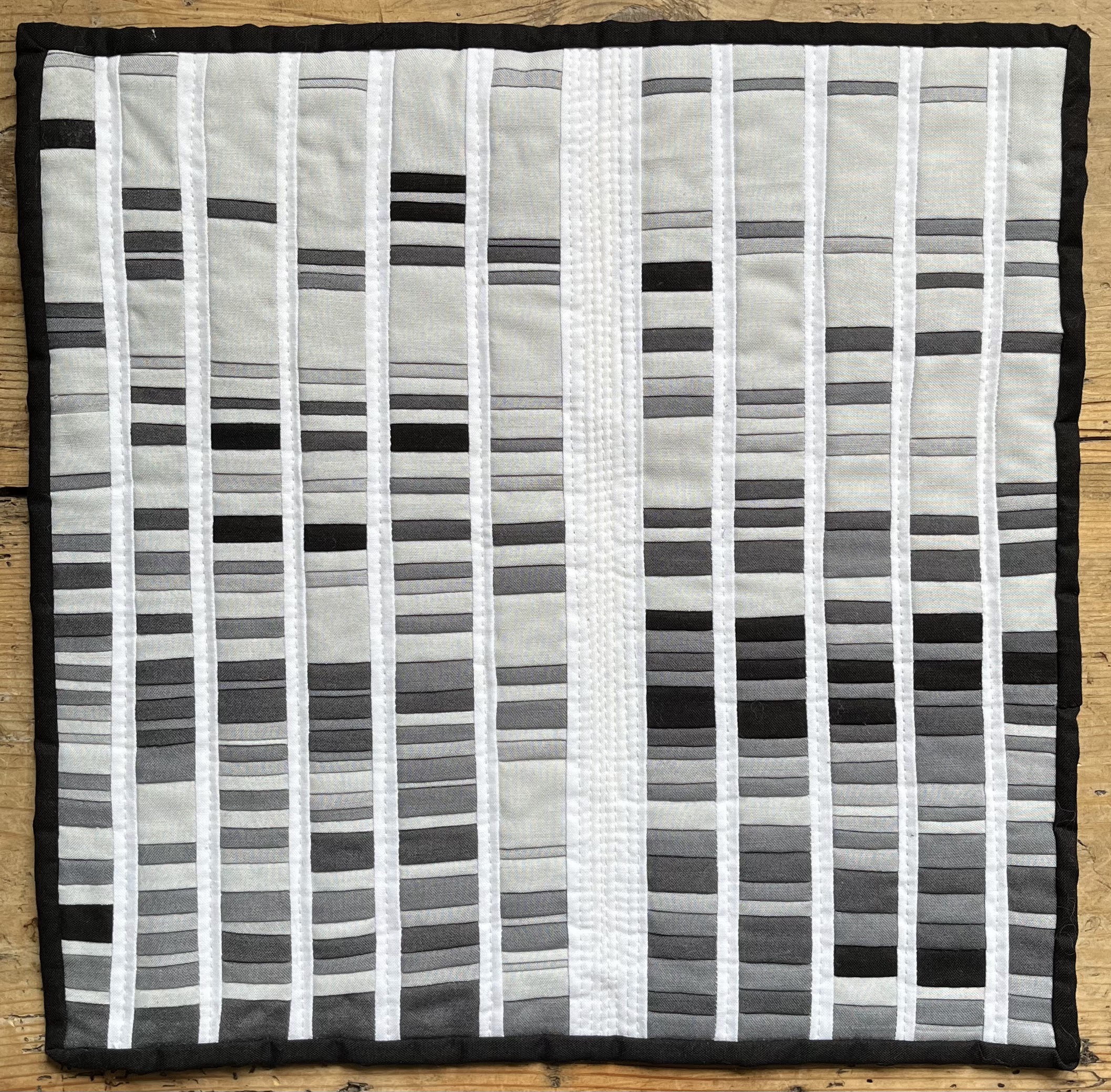 The image on this quilt is a replica of the x-ray film used by Alec Jeffreys to determine the true parentage of Andrew Sarbah in the first legal application of DNA fingerprinting. Foundation paper pieced.