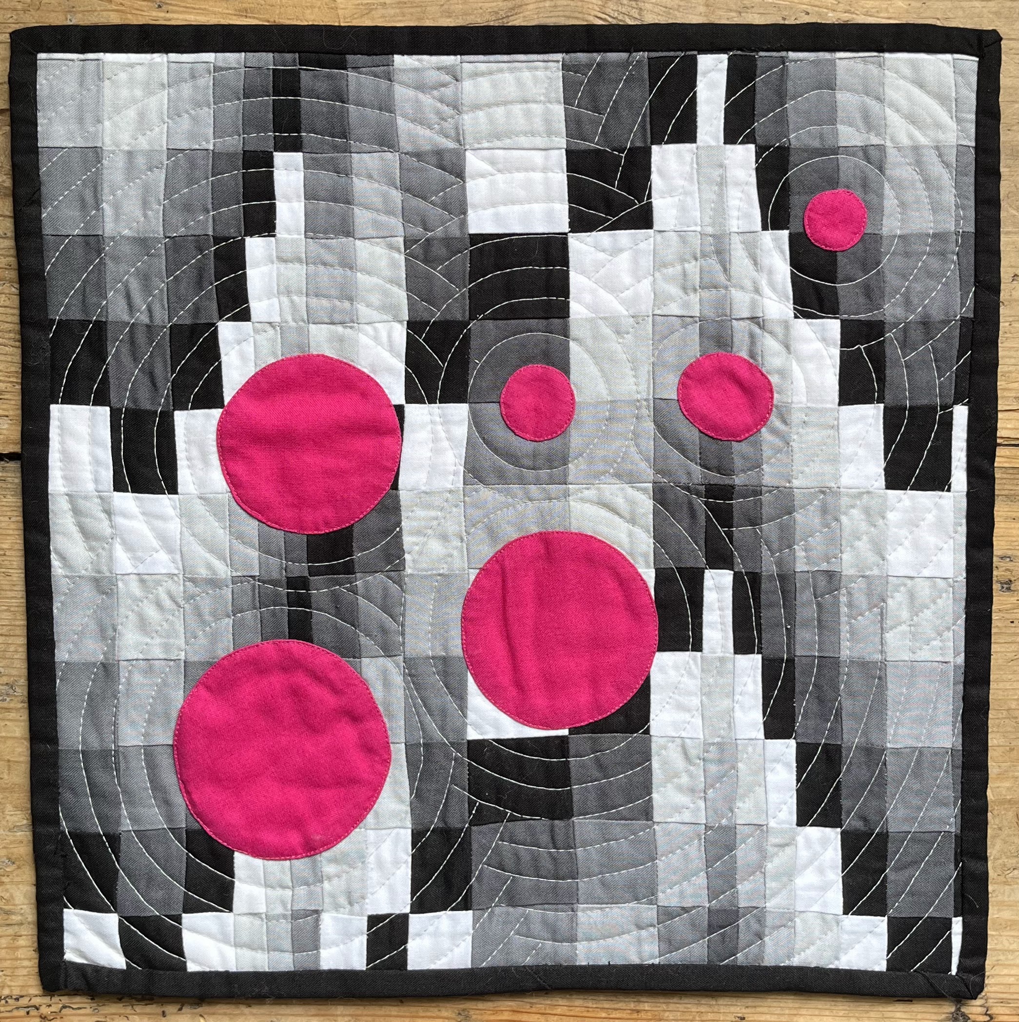 Traditionally pieced mini quilt using the bargello technique but pushing the boundaries by including ¾ inch strips. Machine appliqued hot pink circles added to give a contrast of colour and shape. Inspired by an online sewing course by Phillipa Naylor.