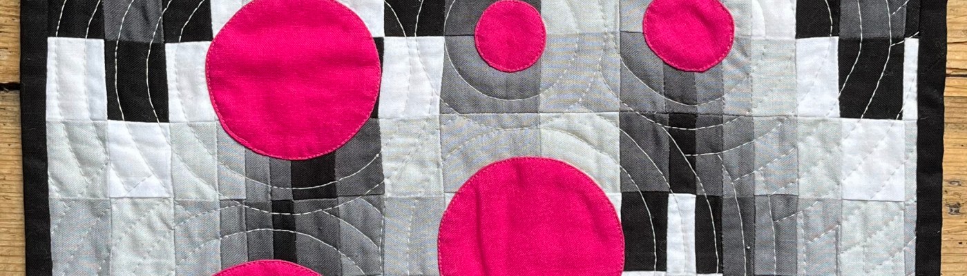 Traditionally pieced mini quilt using the bargello technique but pushing the boundaries by including ¾ inch strips. Machine appliqued hot pink circles added to give a contrast of colour and shape. Inspired by an online sewing course by Phillipa Naylor.