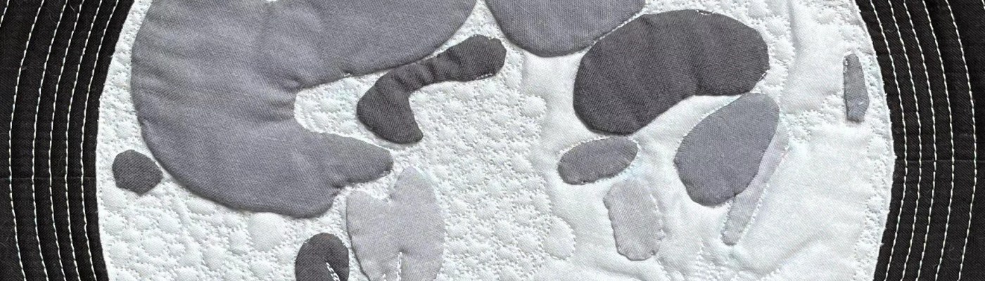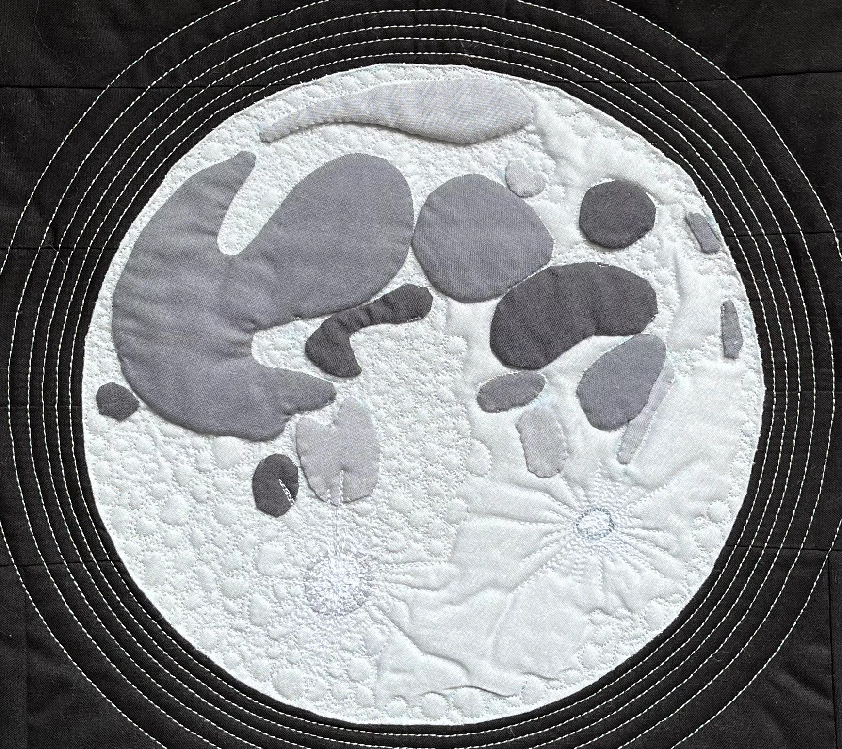 I used needle turn appliqué to create the seas on the moon and free motion quilting for the cratered surface of this old friend, the moon, who I’ve loved staring and smiling at since childhood.