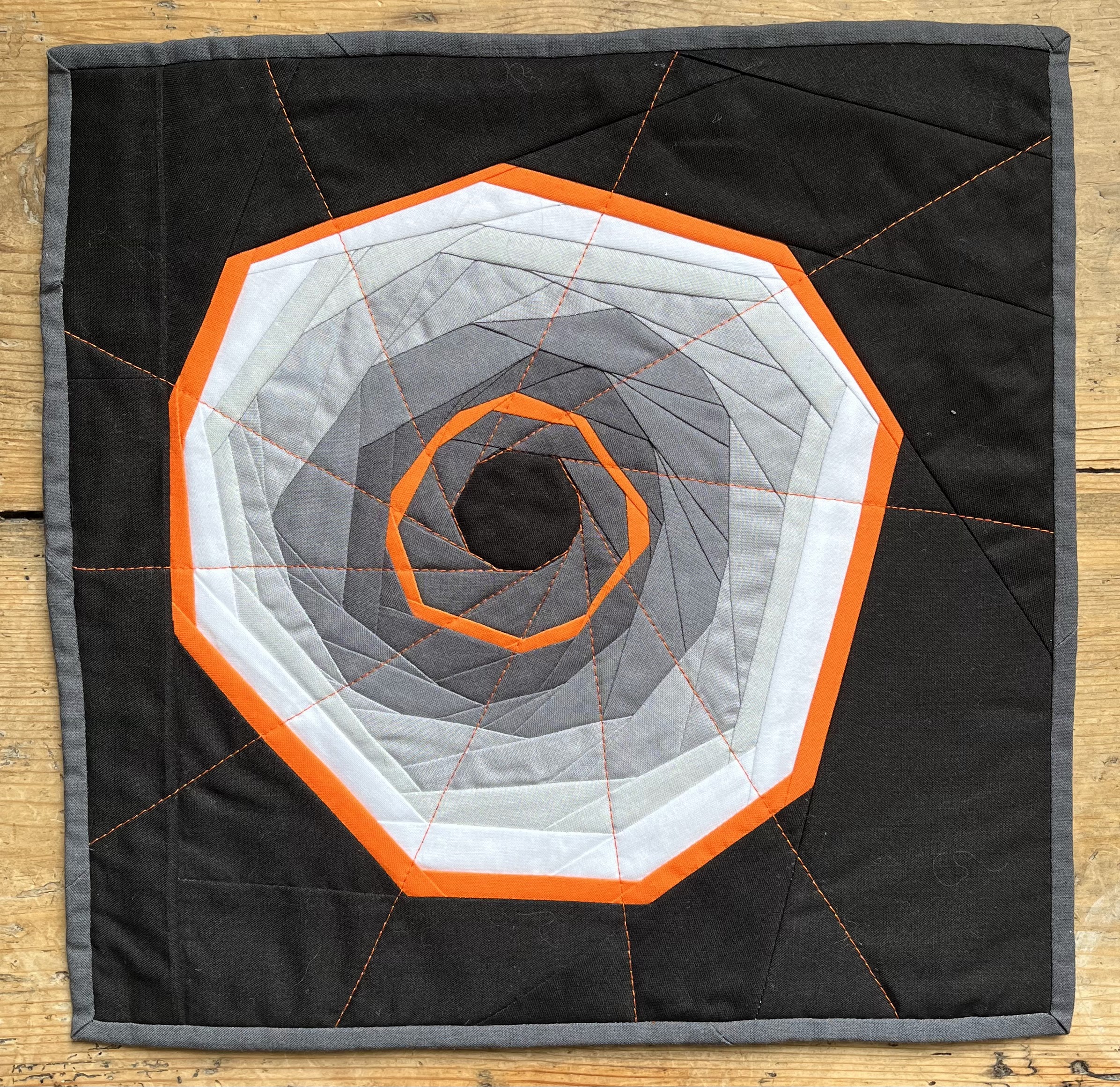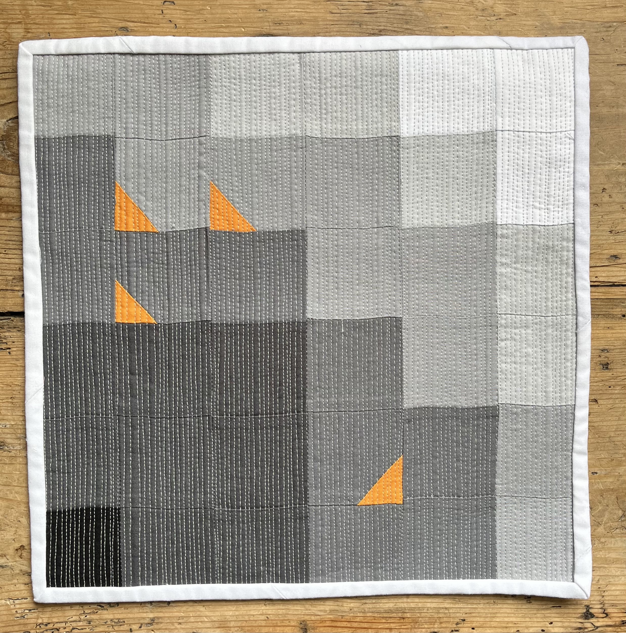 This is the final post in our mini quilt challenge series! The aim of this challenge was to encourage our members to push their boundaries as modern quilters. Participants were given a small bundle of fabrics – black, white and four shades of grey – and challenged to make a mini quilt.