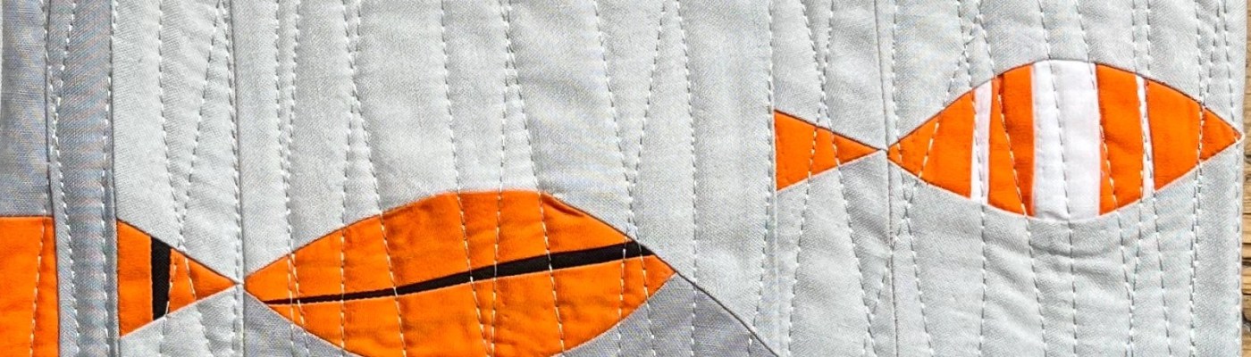 I stitched strips together to make striped fabric, then cut into improv curves and triangles for the fish. The sea is made from blocks of different greys to suggest depth. Machine quilted with metallic thread in a wavy ‘seaweed’ pattern.