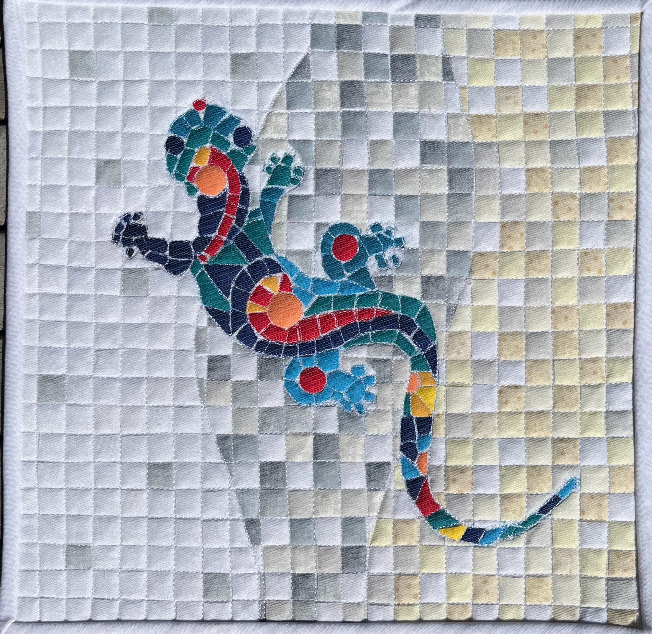 I fell in love with the mosaics of Gaudi in Barcelona on a family holiday in 2015. The gecko motif occurs in several locations but particularly in Parc Guell which inspired my mini quilt. The main challenge was to keep the half inch squares separated by colour shades when arranging the mosaic, particularly when working by an open window! Special thanks to Angie Padilla for tips on technique.